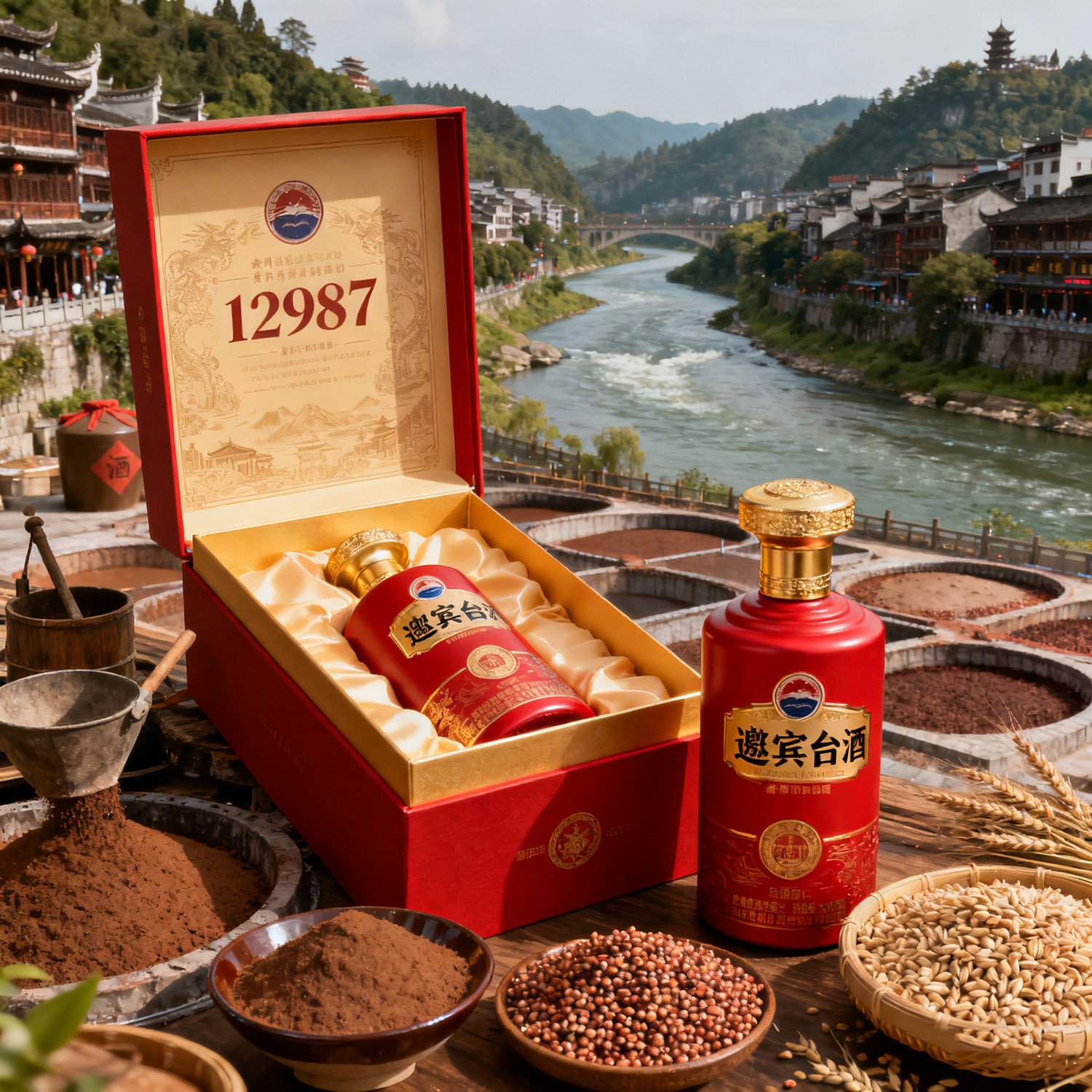 生成一款商標名稱為邀賓臺酒的上開蓋酒盒及酒瓶,以紅色、金色為主基調,含12987工藝及傳統醬香型白酒文化,該酒產自貴州茅臺鎮